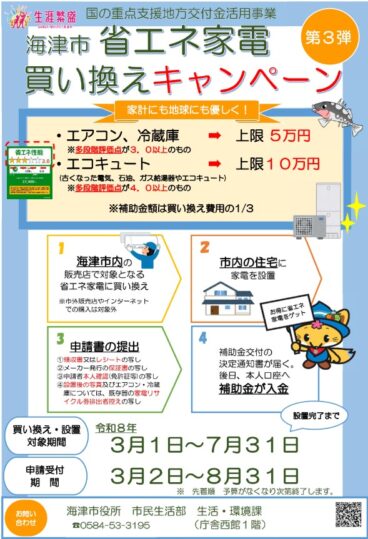 『海津市省エネ家電買い換えキャンペーン第三弾』のお知らせです